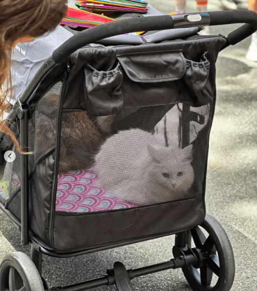 With every stop along the route, each pet’s family could introduce their pets in person outdoors, sometimes from the doorstep, a carrier, or safely inside, sitting in a window where people could admire and greet the featured catwalk kitties.