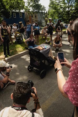 On the catwalk (cue Right Said Fred), the friendly and enthusiastic group of people strolled and rolled along the planned “cat walk” route, passing by my place. The calm and happy group carried signs, cat treats, took photos, cooed, asked questions and interacted with Maudie and Leo (who were safely sitting in the dog stroller we picked up especially for this event).
